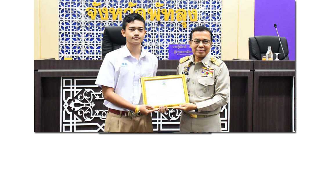 โรงเรียนพัทลุงขอแสดงความยินดีกับเด็กชายปฏิภาณ ปกครอง นักเรียนชั้น ม.2/1 ได้รับประกาศนียบัตรเชิดชูเกียรติผู้กระทำความดีจากผู้ว่าราชการจังหวัดพัทลุง